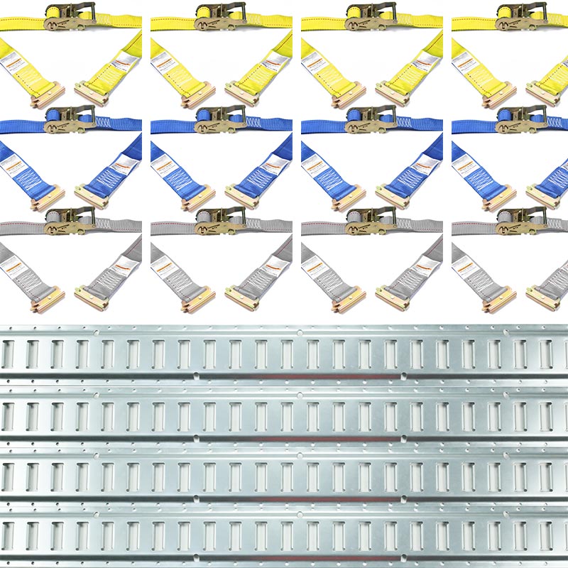 Norėdami pritvirtinti krovinį su šiuo 2 colių E-Track mėlynos spalvos reketo dirželiu, viename diržo gale pritvirtinkite E jungtį į angą ant E-Track bėgio. Apvyniokite juostą aplink krovinį ir kitame diržo gale esančią E jungtį užfiksuokite į kitą bėgelio angą arba į kito bėgio angą, priverždami krovinį prie sienos.